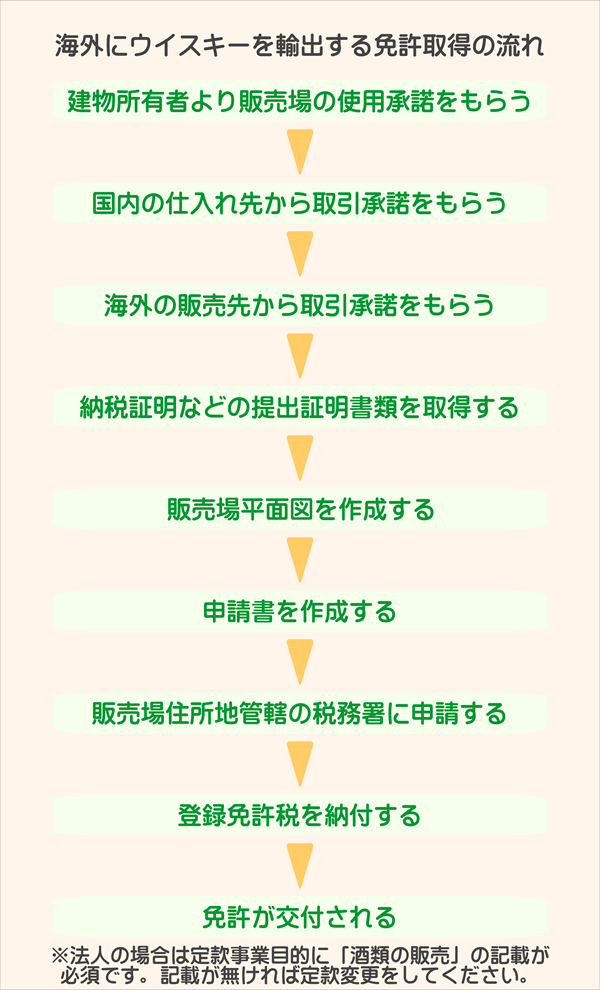 買取リサイクルショップなどが買取ったウィスキーを海外に販売する場合は「輸出入酒類卸売業免許」が必要です。一方、国内で他の酒類販売免許業者に卸販売するのであれば「洋酒卸売業免許」、「店頭販売酒類卸売業免許」が必要です。