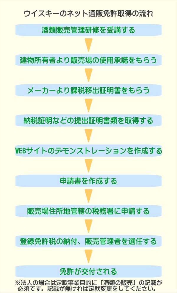 海外産のウイスキーを店頭販売または酒類販売場と同一都道府県内に配達するための免許は「一般酒類小売業免許」です。酒類販売場から都道府県を超えて消費者等に通信販売するのであれば「通信販売酒類小売業免許」となります。