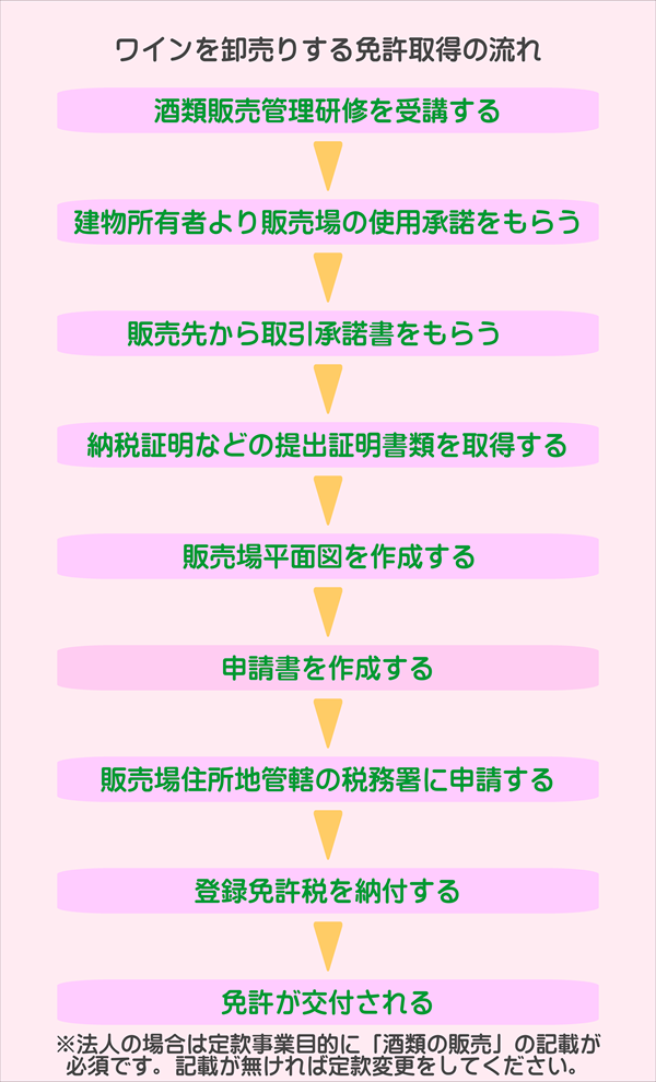 「洋酒卸売業免許許」→海外製ワインであれば自己が輸入したもの以外も扱える。国産ワインは大手メーカー製も含め扱える。ただし、酒類販売管理研修を受講しないと取得できない。